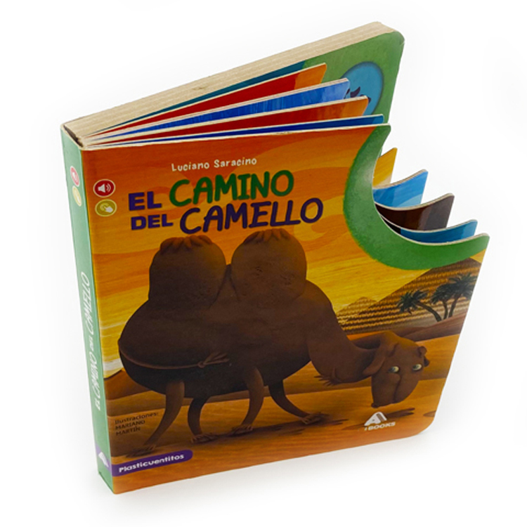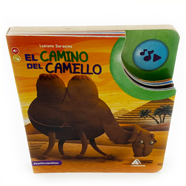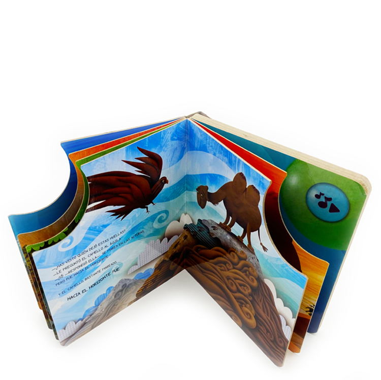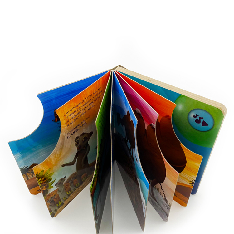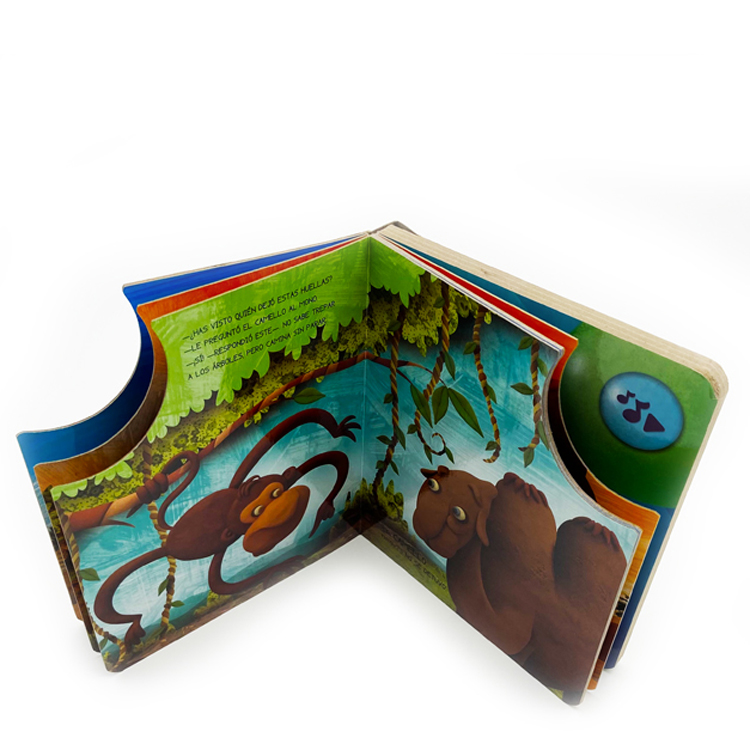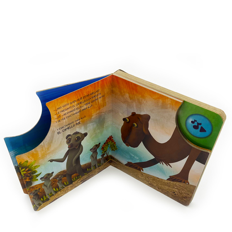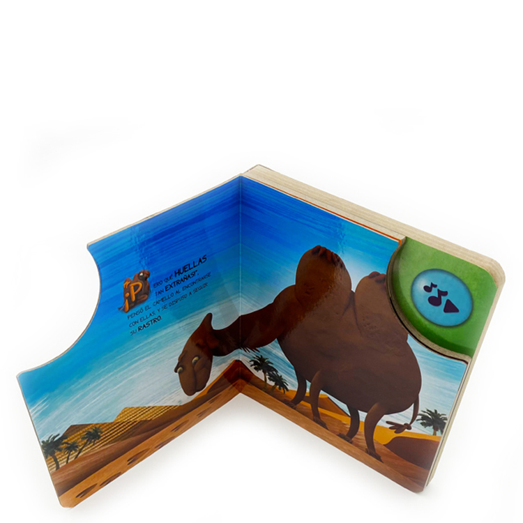Spread: 8 spread including cover Size:18 x 21x 2cm Material and Printing:Cover and inner pages: 400gsm grey cardboard + 400gsm grey cardboard , 4C/4C printing,gross lamination, back cover: thickess 1cm, the sound chip fix at the back of the cover. |