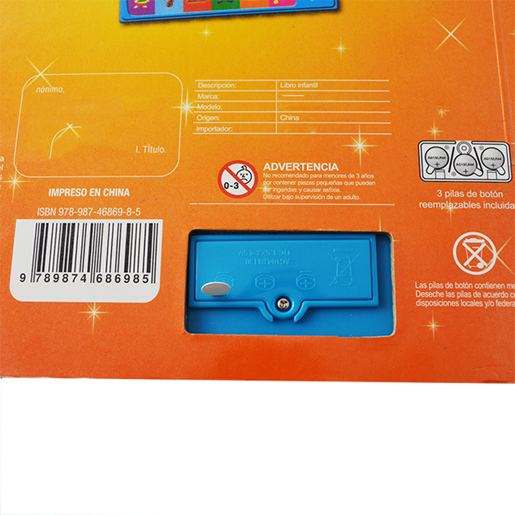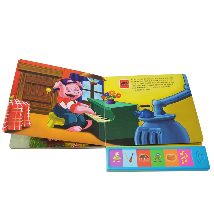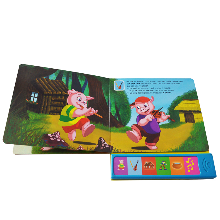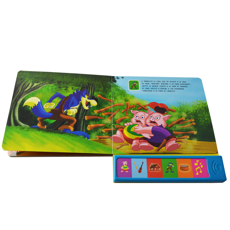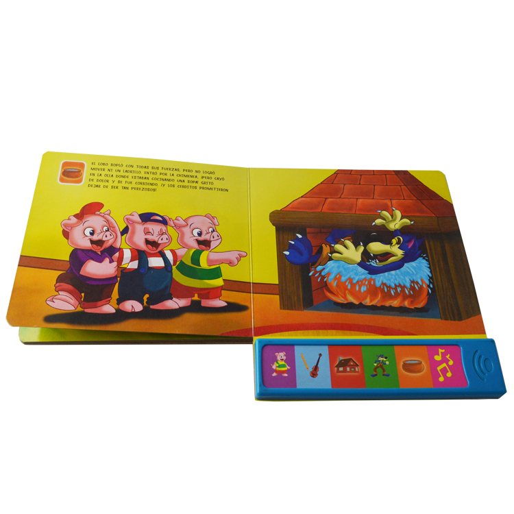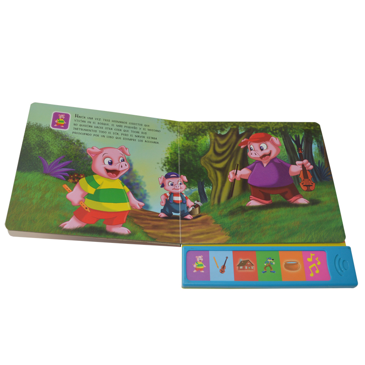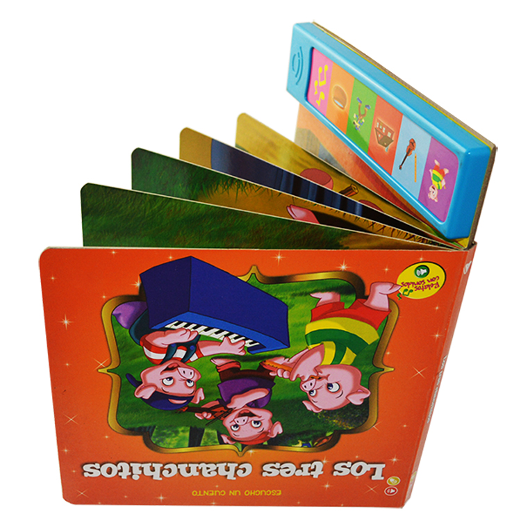 Spread: 6 spread including cover Size:18x 23cm Material and Printing:Cover and inner pages: 350gsm C1S paper+350gsm C1S paper , 4C/4C printing,gross lamination, back cover: the sound chip fix at the back of the cover. Binding: board book binding packing: one carton weight not exceed 10kgs |