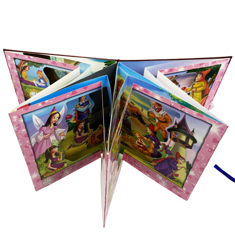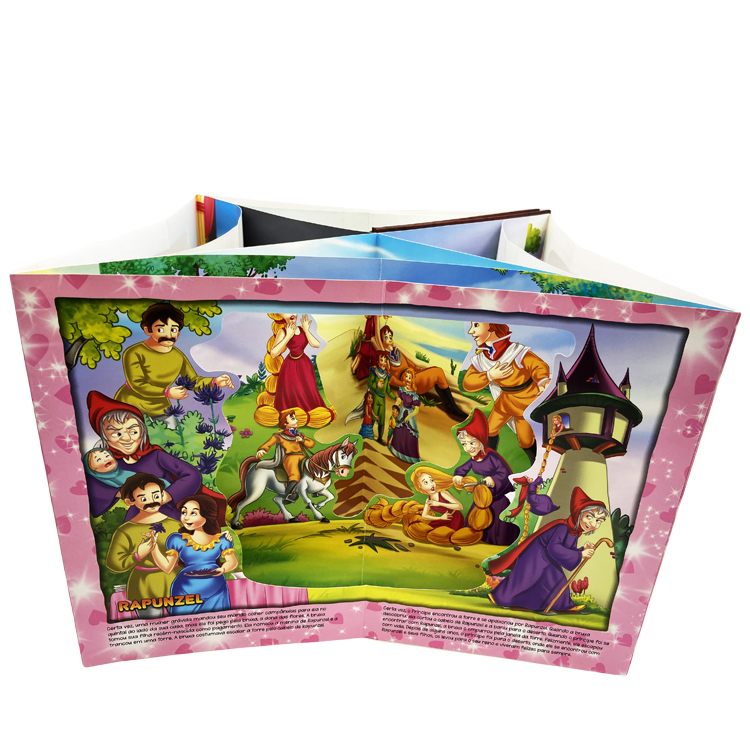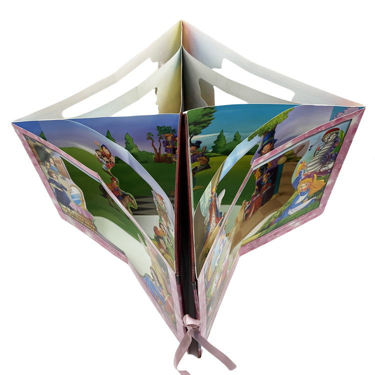 Size: 255 x 255mm Material and Printing: Cover:128gsm artpaper, 4C/0C printing with gross lamination+2mm grey board+3mm foam Inner pages: 4 spread not including cover, each spread have three pop up layer The spread material:400gsm cardboard with grey back+400gsm cardboard with grey back, no printing Pop up layer: 250gsm C2S paper, with 4C/0C printing, UV coated. First layer size:280*247mm Second layer size: 340*247mm Third layer size: 360*247mm Binding: boardbook binding 3. Packing: carton weight not exceed 10kgs |