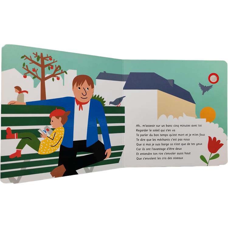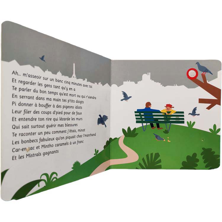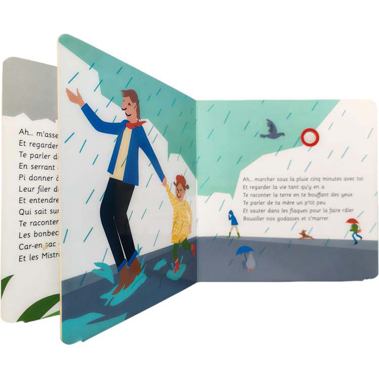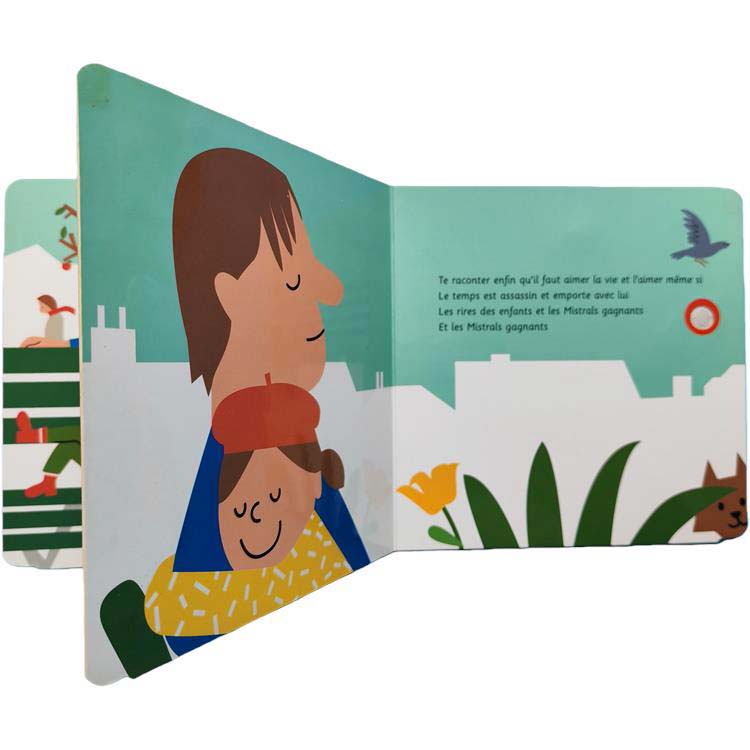 Spread: 6 spread including cover Size:15.5 x 15.5 x 1.5cm Material and Printing:Cover and inner pages: 350gsm C1S paper+350gsm C1S paper , 4C/4C printing,gross lamination, back cover: thickess 1cm, the sound chip fix at the back of the cover. Binding: board book binding packing: one carton weight not exceed 10kgs |